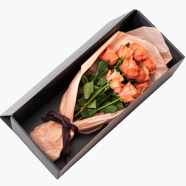10 roser i en nydelige fersken-rosa farge. En flott blomstrende gave til den du vil glede. Denne vakre blomsterhilsenen leveres i vår eksklusive gaveeske.
